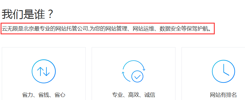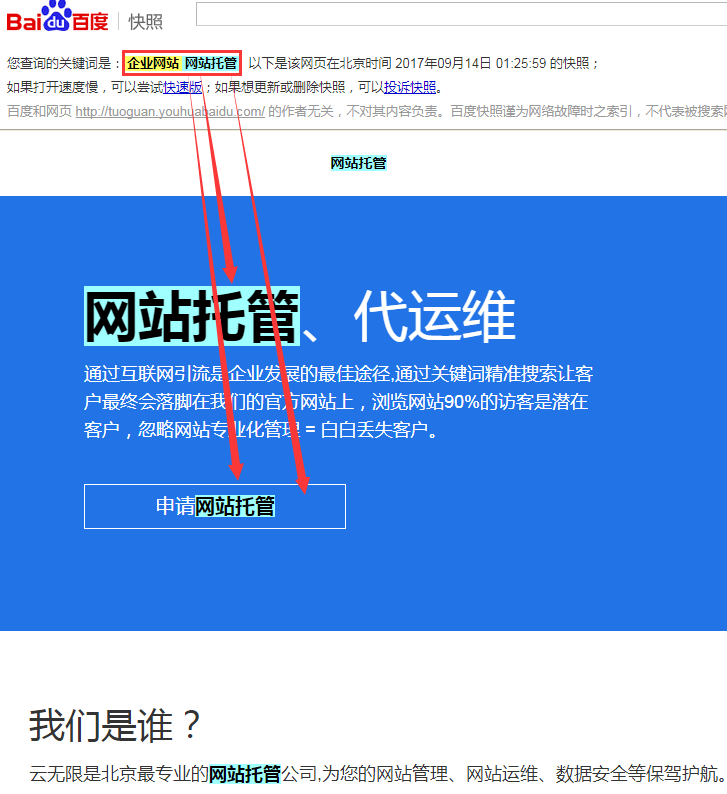 关键词排名状况:“企业网站托管”排名74位【网站内容修改如下】云无限是北京最专业的网站托管公司,为您的网站管理、网站运维、数据安全等保驾护航。修改为:云无限是北京最专业的网站托管公司,为您提供企业网站托管、网站运维、数据维护等服务。