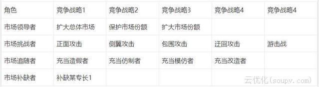 前两点很有把握后,这一点就会有些清楚,再次思考可以自检、修正,甚至需要反复进行对此的思考。下表竞争战略可供参考。根据自身以及对手的角色,可以进一步认识自身。